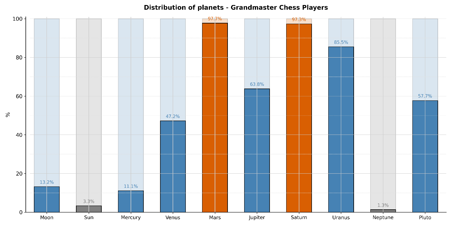 Each bar corresponds to a planet and shows the associated probability, expressed as a percentage. Values within the range expected under random chance (between 5% and 95%) are shown in blue, while significant deviations are highlighted using different colors: grey for underrepresentations (below 5%) and orange for overrepresentations (above 95%). For example, for the Sun, the probability that a random sample would show a lower value is approximately 3.3%.