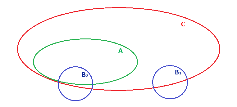 The first statement (all A are C) is easy to represent: draw circle A inside a larger circle C. The second statement (some B are C) is less simple to represent: draw circle B, where only part of it lies within circle C, but we do not know where circle B is positioned relative to circle A. There are two possibilities: one where circle B has no relation to circle A (B1), and the other where circle B overlaps circle A (B2).