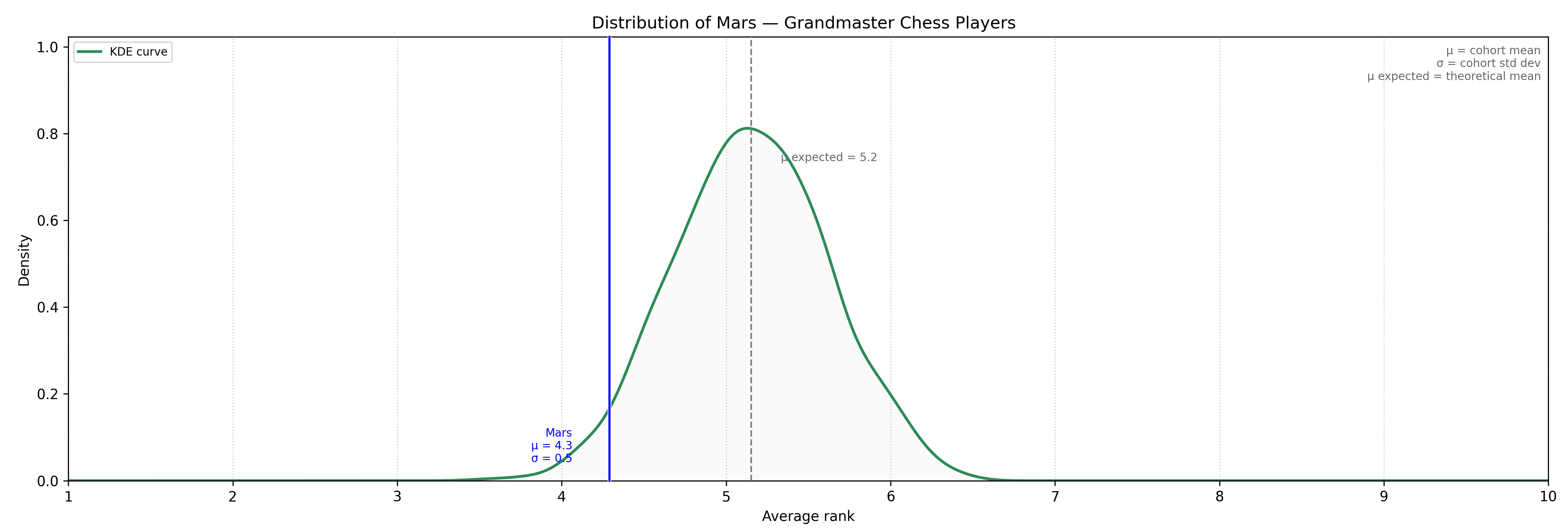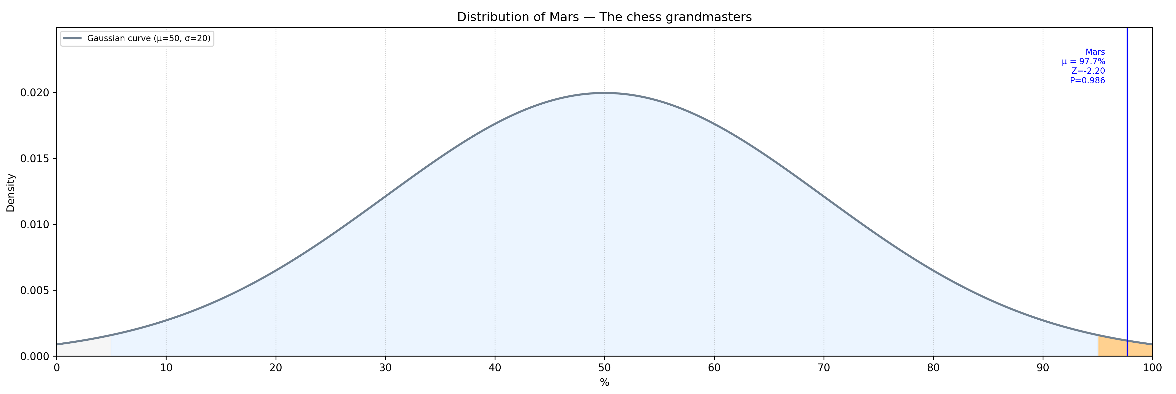 A Gaussian function is an exponential function used to represent the distribution of a dataset based on the density of its values. The following Gaussian curve illustrates the probability of observing, in the general population, a lower valuation of Mars than the one found among chess grandmasters.