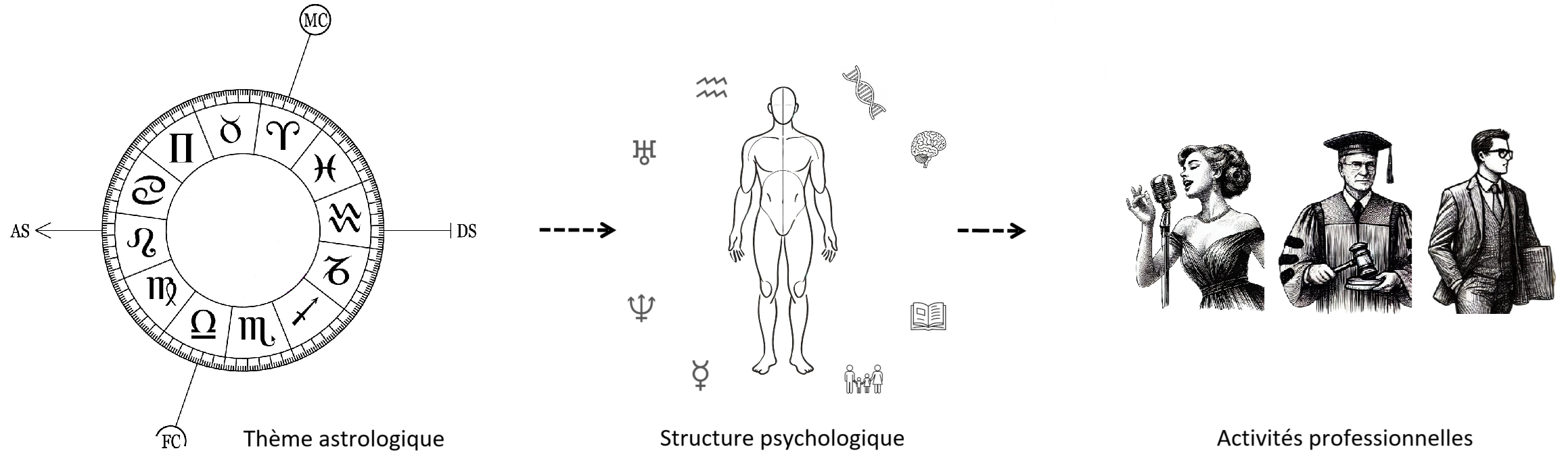 The relationship between an astrological chart and the chosen activity is not linear. The chart influences the individual's personality, but other factors come into play, including biological, sociological, and educational influences. Nevertheless, astrological portraits allow us to highlight the general traits of a personality.
