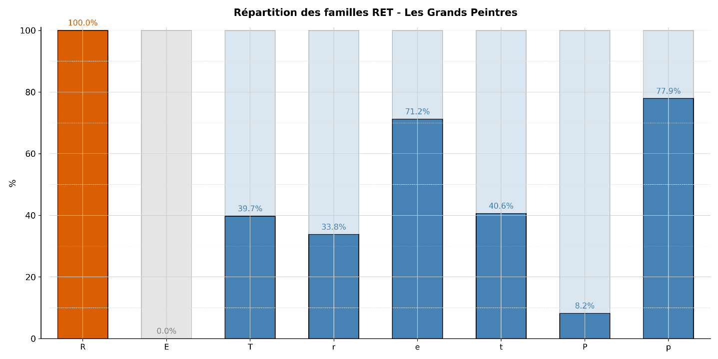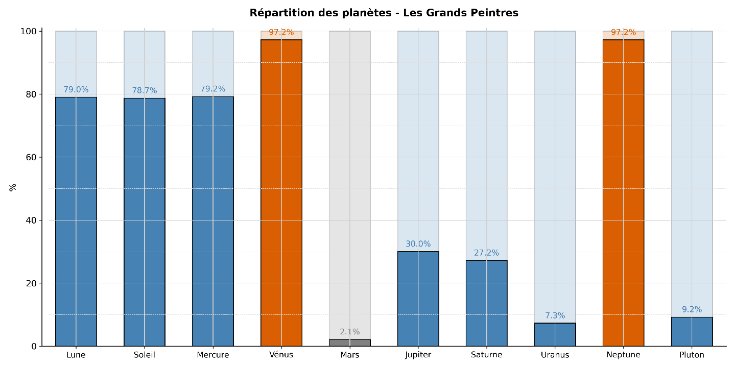 This view is based on the observed astro-statistical results: among great painters, the family of extensive representation, or "R," is overvalued. In contrast, the family of intensive existence, or "e," which includes both Venus and Neptune, shows no overvaluation. One observes a very dominant Neptune on one side, and a very strong "R" Venus on the other. It thus seems coherent to distinguish art as falling under the Neptunian function, and painting as falling more specifically under the Venusian function.