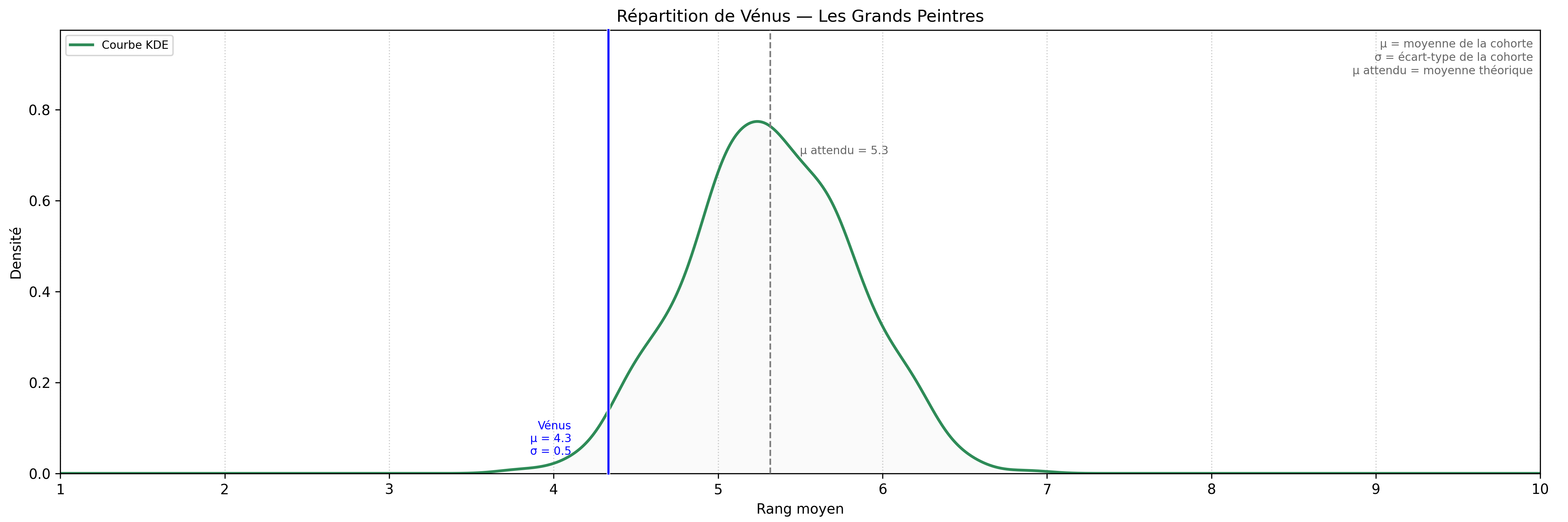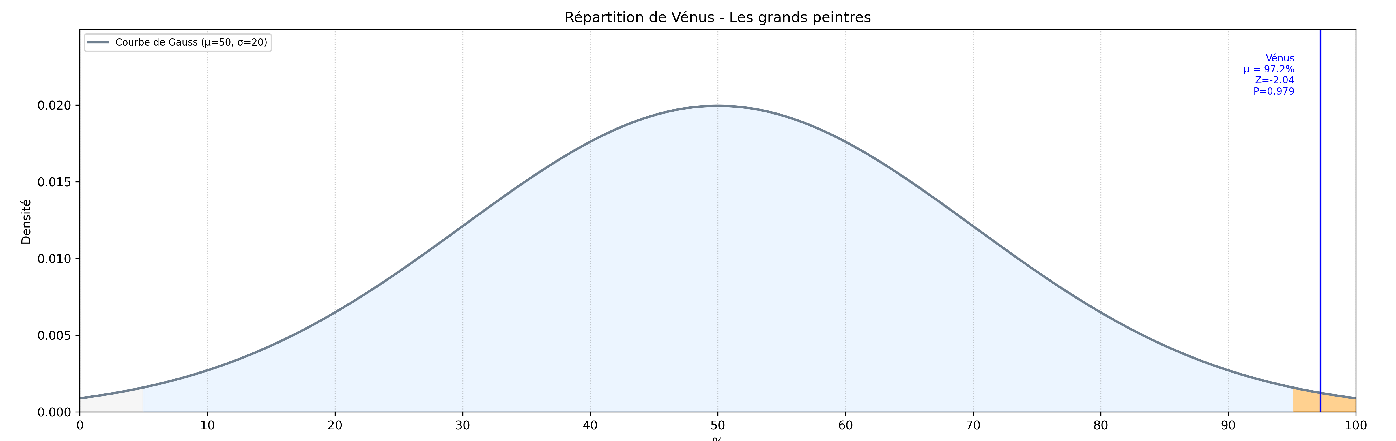 A Gaussian function is an exponential function used to represent the distribution of a dataset based on the density of its values. The following Gaussian curve illustrates the probability of observing, in the general population, a lower valuation of Venus than the one found among great painters.
