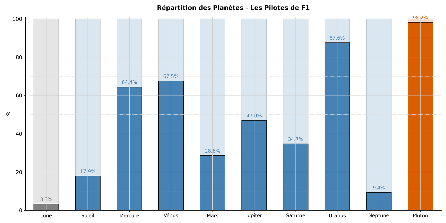 Do these exceptional performances stem solely from talent and training, or could more subtle factors—such as astrological configurations—also play a role in shaping predispositions in this field? Like Fields Medalists and top-level chess players, do Formula 1 drivers exhibit distinct planetary dominances compared to the general population?