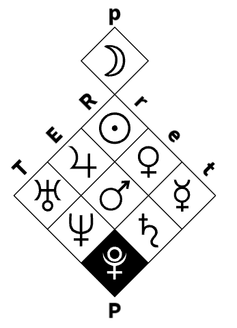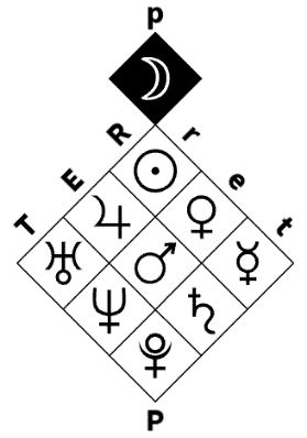 The planets forming the "extensive power" family (Sun-Mars-Pluto) and the "intensive power" family (Moon) facilitate different states of concentration on one's environment and field of perception. The planets in these families start from a source level and tend toward an identical goal level: "rR" for the Sun, "eE" for Mars, "tT" for Pluto, and "p" for the Moon, which constitutes a planetary family on its own. They thus maintain maximum concentration on a given level of reality.