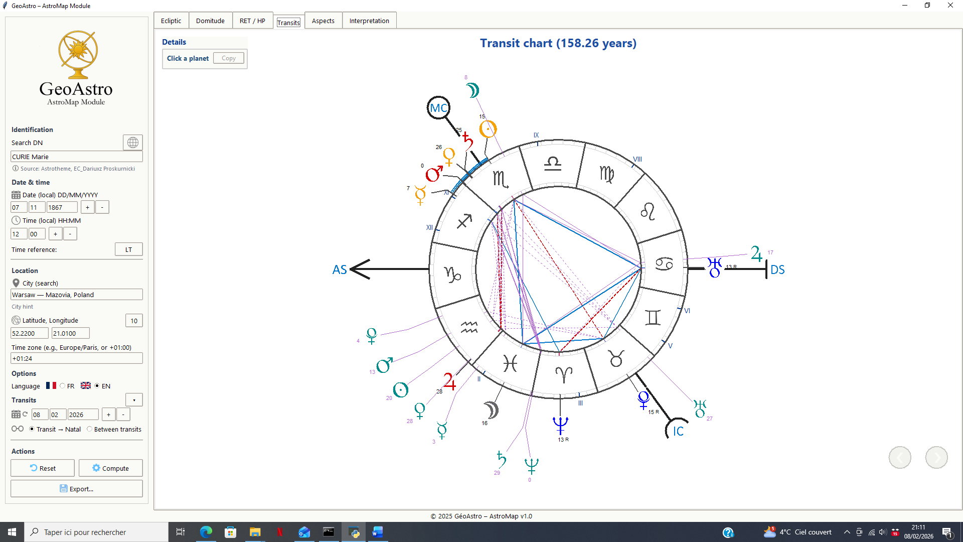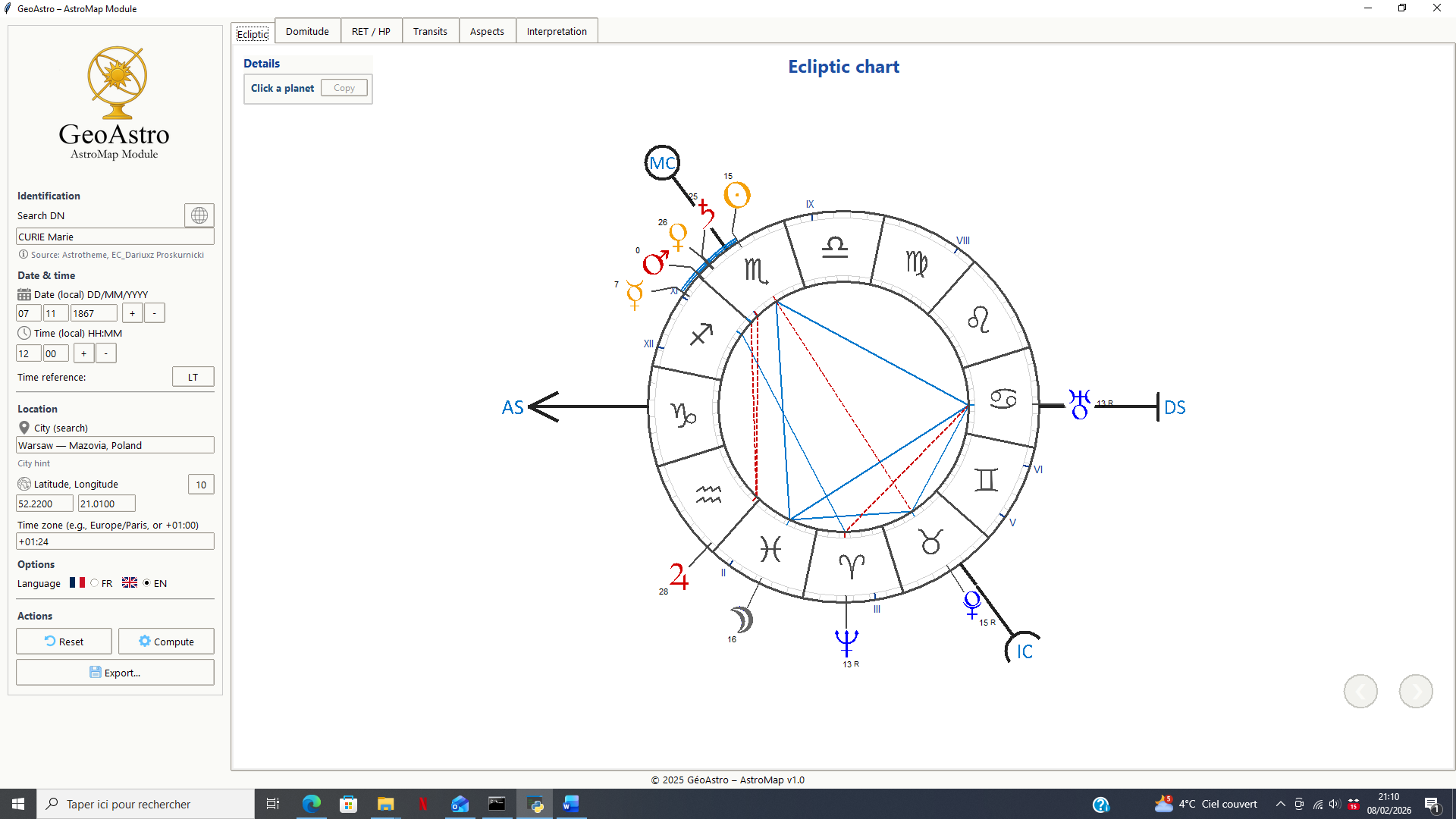 AstroMap allows users to display either the chart of a public figure selected from a natal database or that of an individual entered manually using date, time, and place of birth.