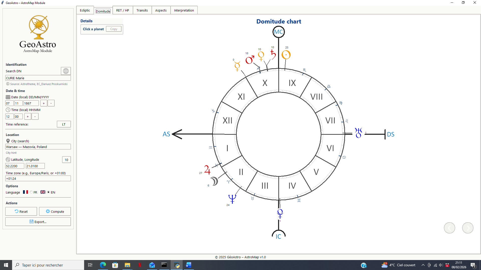 The second tab presents the chart projected in real domitude, based on the local sphere, allowing planets to be located in relation to axes and houses.