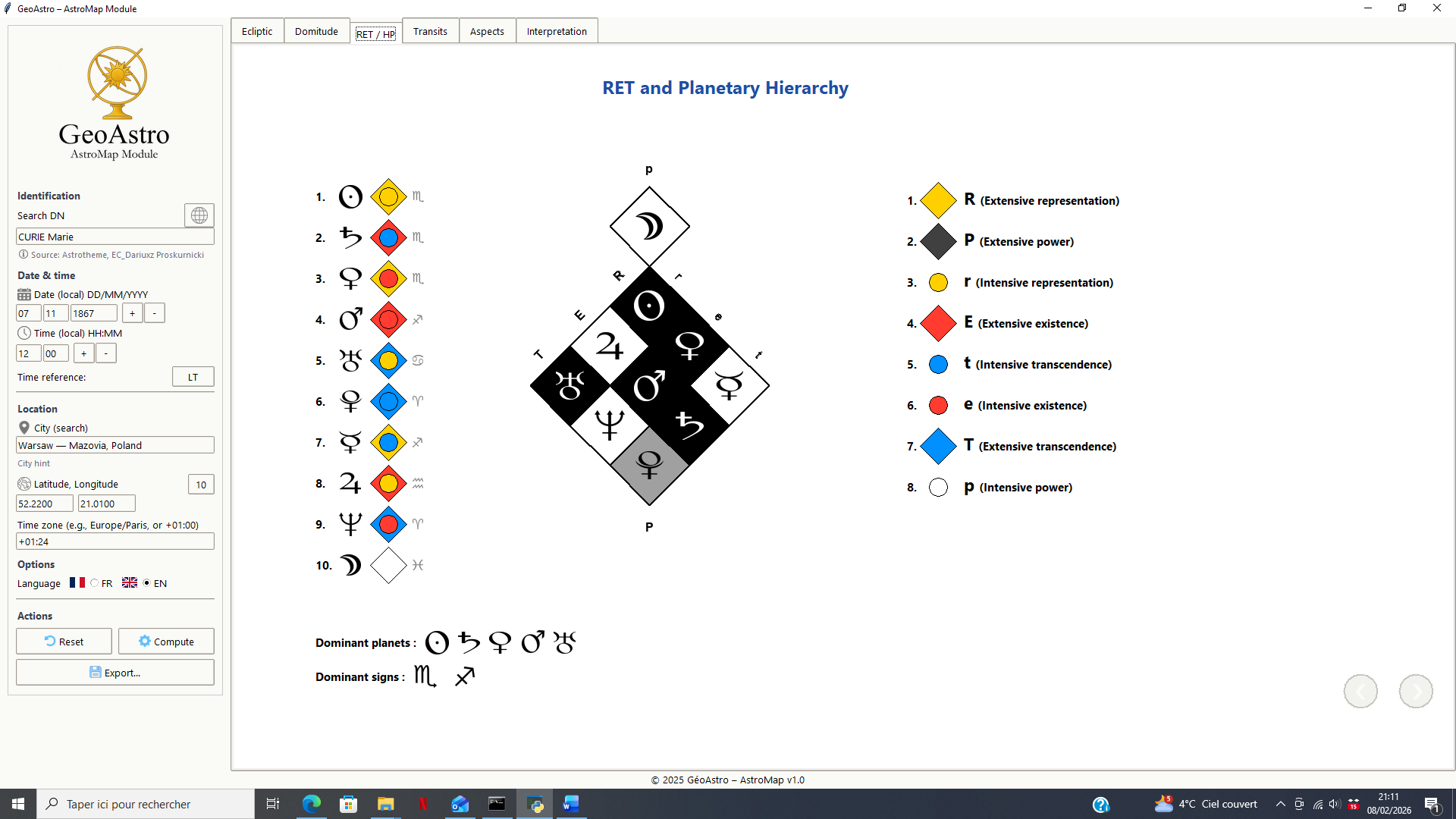 The output is an ordered planetary hierarchy, subsequently transposed into the R.E.T. families (Representation, Existence, Transcendence), according to coherent and reproducible rules.