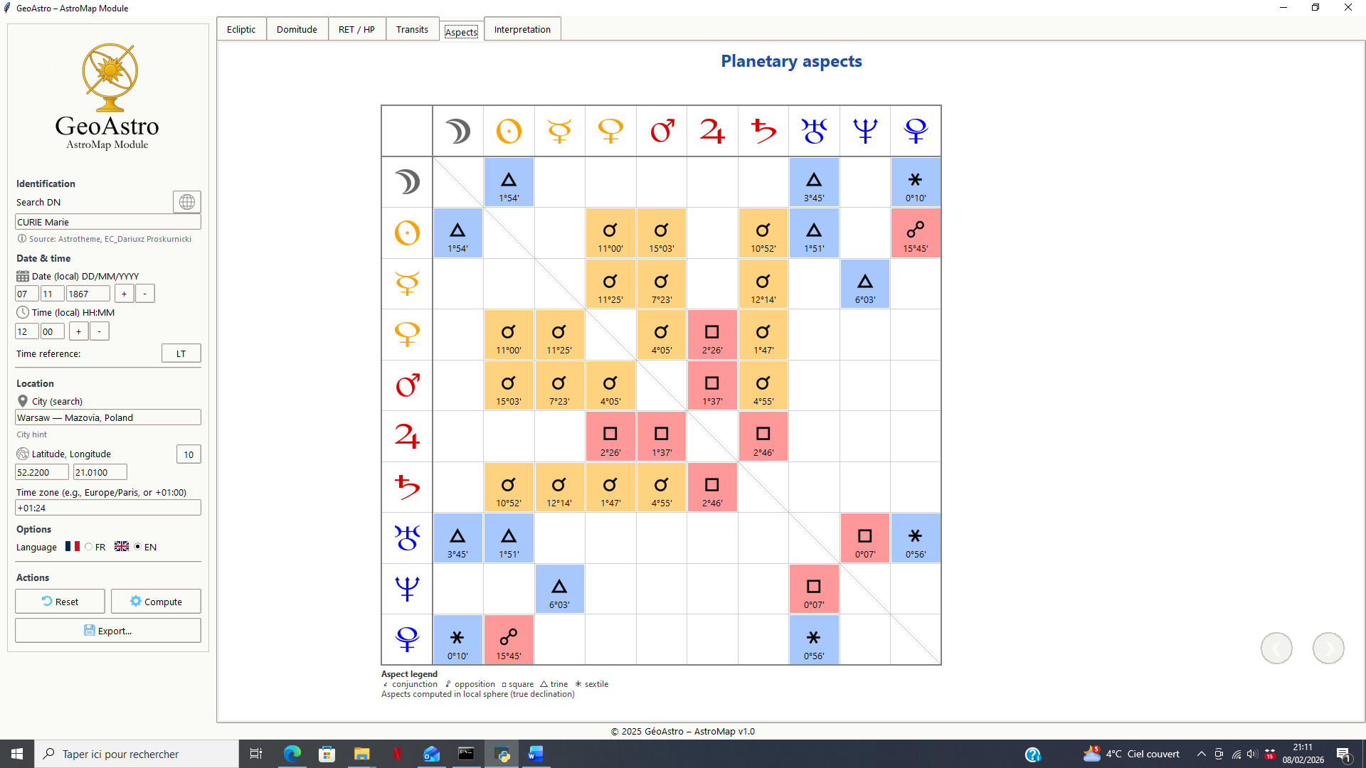 This tab displays a synthetic matrix of planetary aspects, calculated from actual positions in the local sphere.