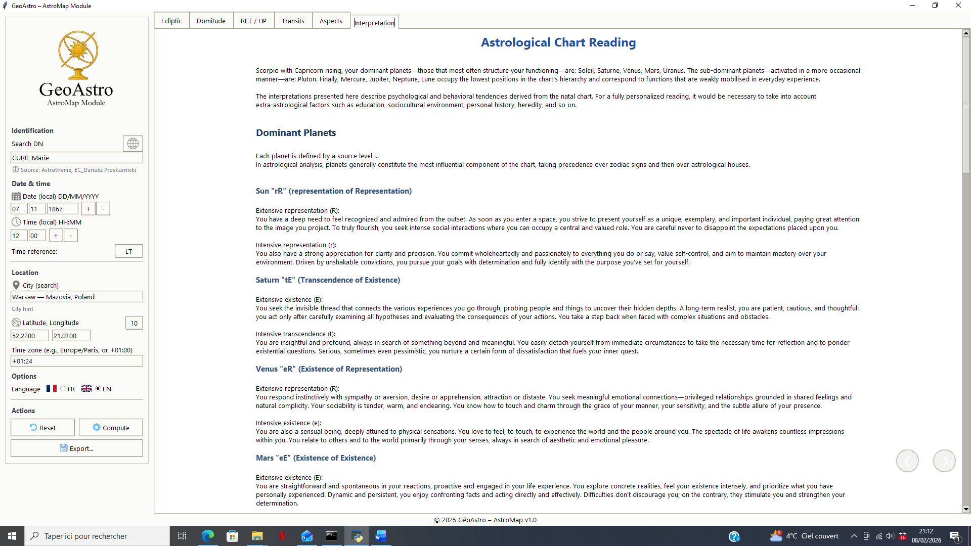 The personalities available rely on an extensive natal data archive, including more than 8,000 birth charts originally compiled by Xavier Ego. This historical database has been progressively expanded and is intended to continue growing.
