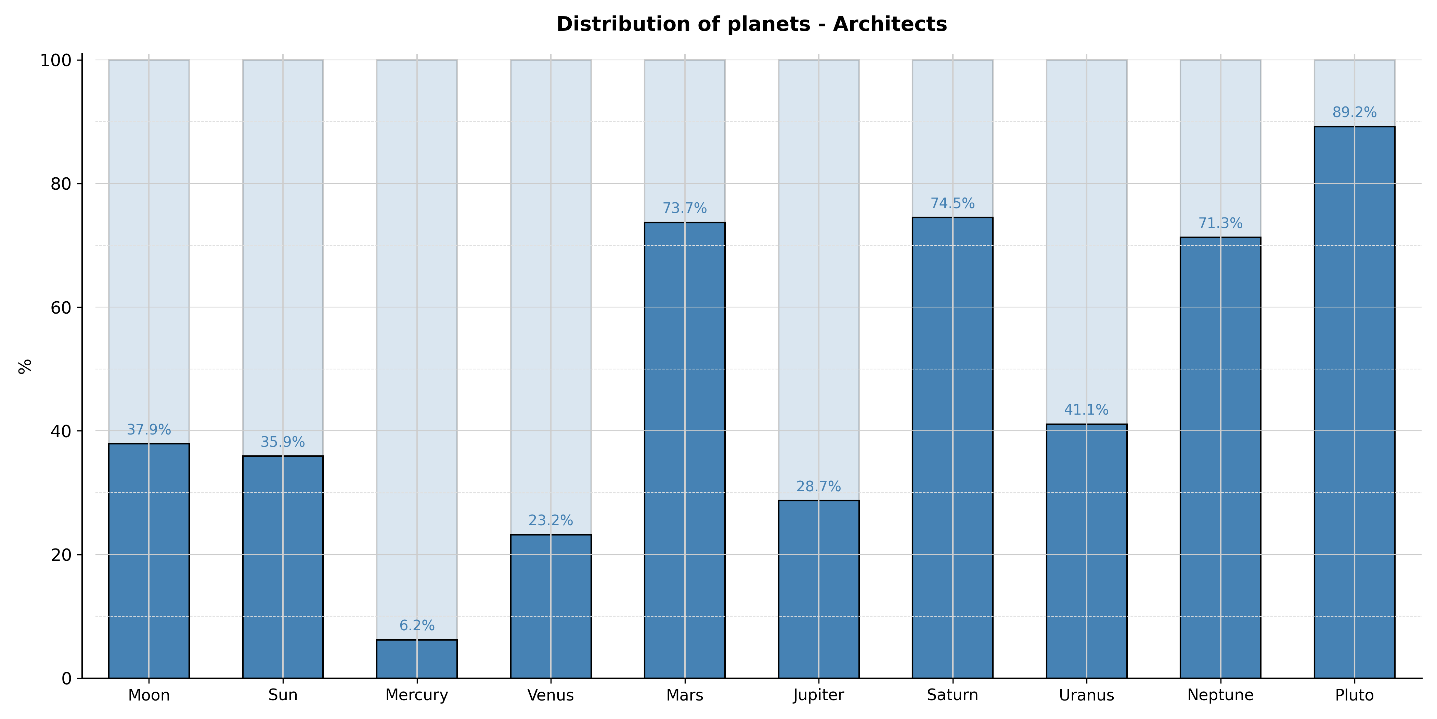 These results correspond to "normal" statistical fluctuations and likely stems from the multidisciplinary nature of architecture, which relies on a wide range of skills and aptitudes: mathematics, geometry, geology, material strength, as well as visual arts for designing and drawing buildings. This discipline requires great versatility, making it less suitable for astro-statistical studies than other more specialized fields, such as the Fields Medalists, whose skills concentrated in a specific cognitive domain.