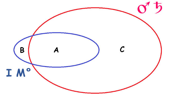 Let the red circle represent the entire population marked by the planet Mars, the planet Saturn, or both simultaneously; and the blue circle (IM°) the population gifted with a highly developed so-called mechanistic intelligence. We can thus distinguish three categories of people: in "A," the Mars-Saturn individuals with a high level of mechanistic intelligence; in "B," the non-Mars-Saturn individuals with a high level of mechanistic intelligence; and in "C," the Mars-Saturn individuals who are not gifted with high mechanistic intelligence.