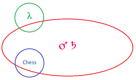 Let the red circle represent the entire population marked by the planet Mars, the planet Saturn, or both simultaneously; and the blue circle (Chess) represent the population of international grandmasters in chess. Finally, the green circle () represents a sample of the general population, assumed to contain an "average" proportion of individuals with Mars or Saturn, or both, among their astrological dominants.