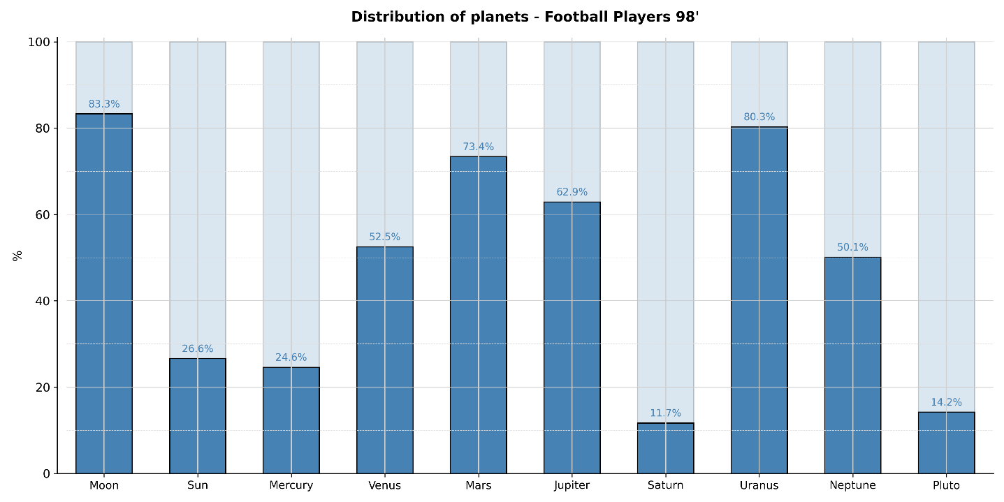 Reaching the highest level in football primarily requires natural physical abilities (biological reference) that align with the demands of the sport: explosiveness, sprint endurance, aerobic stamina, etc. One must also consider the personal investment in the discipline, influenced by the educational background and environment of each player. However, based on our statistical results, the talent of these elite football players does not seem to be correlated with their astrological chart8.