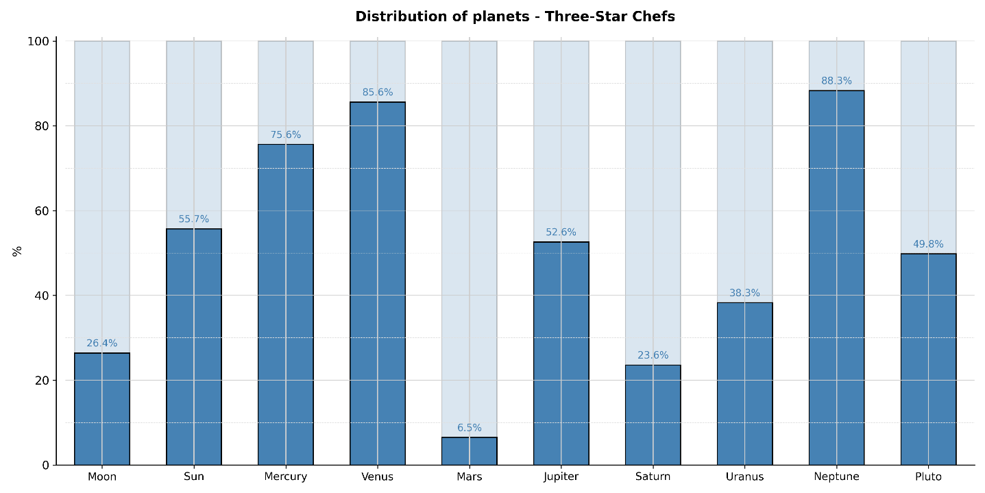 Once again, the graph shows no atypical results. Therefore, there is no link between this activity and an astrological planet or a RET family, which were also tested. To further study the three-star chefs, it would be pertinent to examine their life conditioning: their background, educational influences, and early role models.