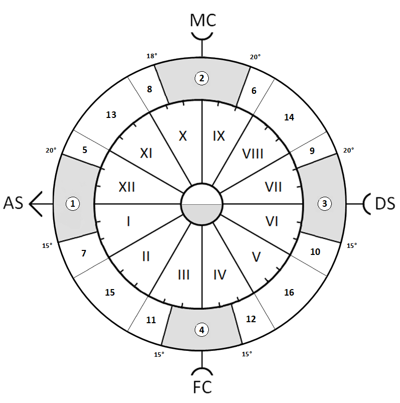 The concept of "domitude" places the twelve astrological houses within the local sphere, allowing visualization of the organization of valorization zones. The diagram shown here illustrates sixteen zones, ranked by order of importance, with their extent defined by observation. Zones 1, 2, 3, and 4, located around the angles of the Ascendant, Midheaven, Descendant, and IC, are considered the most influential because they contain the so-called angular planets. After the angularity criterion, the planetary aspects, calculated in the ecliptic chart and considering their order of importance, continue the chart’s hierarchization6.