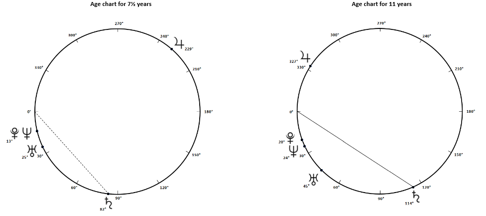 - At 7½ years, Saturn forms its first square to its natal position; this is when the child reaches what psychologists call “the age of reason.” From the age of 5, Saturn had already formed its first sextile.